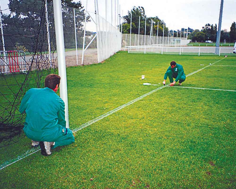 - Mit synthetischen Grasimplantaten, die in den Boden getrieben werden. So werden die wichtigen Punkte für die Linierung von Spielfeldern gekennzeichnet. Ein unentbehrliches innovatives Hilfssystem für die Linienmarkierung von Fußballfeldern und Sportplätzen.