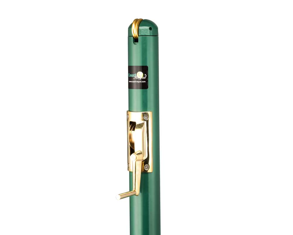 - Stahlrohr Tennisnetzpfosten ∅ 76 mm, Oberfläche verzinkt und grün kunststoffbeschichtet. Netzhaken zur Befestigung des Stahlseils und Befestigungslaschen für das Tennisnetz sind fest am Tennispfosten angeschweißt. Mit eingebauter Zahnradmechanik aus Messing zum einfachen spannen der Tennisnetze. Die Spannmechanik aus Messing ist leichtgängig, einfach zu bedienen und ist zusätzlich mit einer abnehmbaren Kurbel ausgestattet. Die eingelassenen Seillaufrollen aus Messing gewährleisten einen perfekten Sitz des Stahlseiles.
