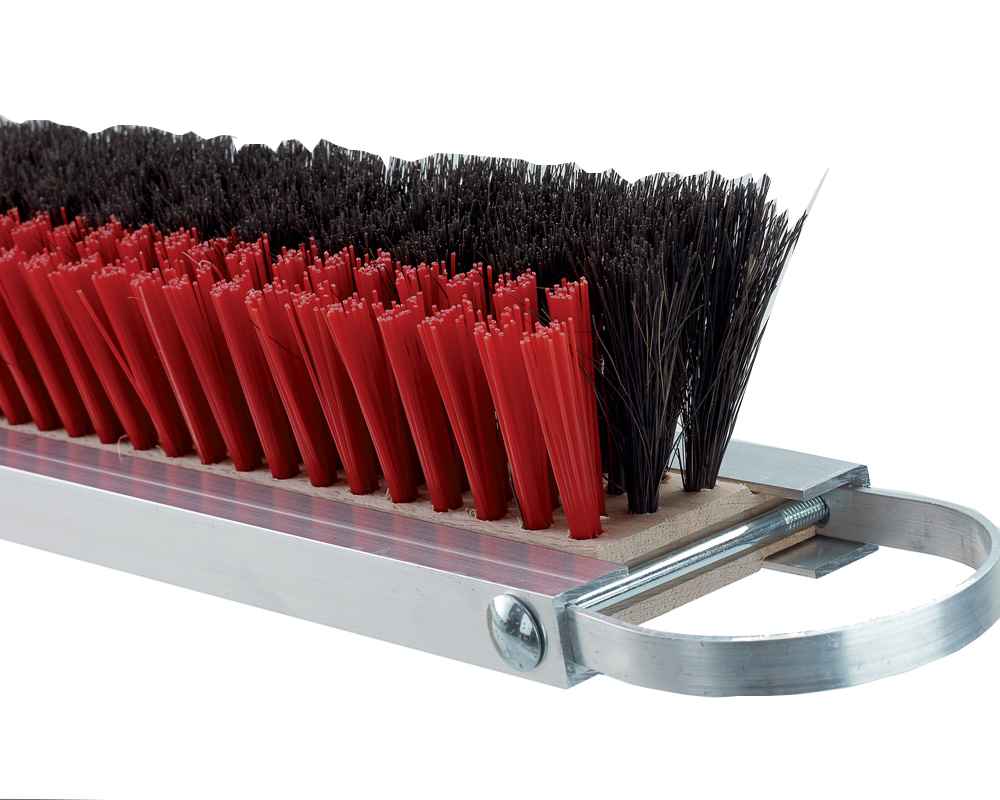 Der neu entwickelte Abziehbesen 200 cm breit, mit 4 auswechselbaren Besenteilen, ist das optimale Pflegegerät für den Sandplatz. Der Besatz besteht aus zwei Reihen Kunststoff und drei Reihen Arengaborsten. Die Kunststoffborsten im vorderen Bereich lockern das Material auf, die Arengaborsten im hinteren Bereich verteilen das aufgelockerte Material gleichmäßig auf dem Platz. Das Aluminium-Basisgestänge ist an beiden Seiten mit Netzabweisern versehen. Kompl. mit zweiteiligem, sehr stabilem, Alu-Zugbügel.