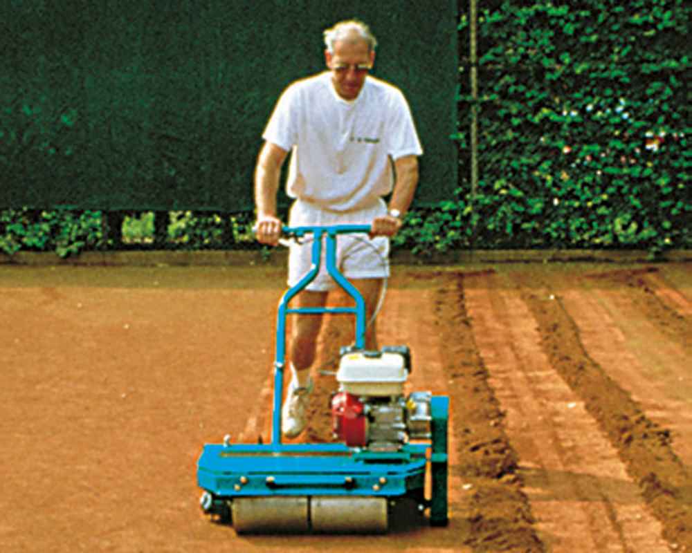 - Motorbetriebene Tennisplatz Fräse zum Abfräsen der verbrauchten und verhärteten Ziegelmehldecke. Millimetergenaue Einstellung der Frästiefe, streifenförmige seitliche Ablagerung des Ziegelmehls. Die Tennisplatz Maschine reduziert den Zeitaufwand bei der Frühjahrsinstandsetzung auf ca. 1 Stunde pro Tennisplatz.